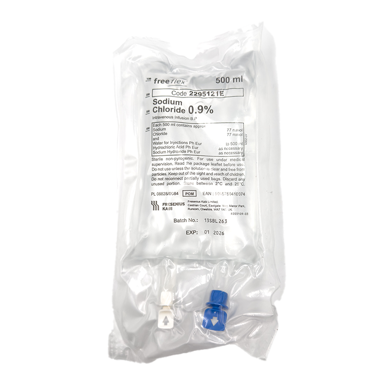 • Saline concentration: The IV bag contains a sterile saline solution with a concentration of 0.9% sodium chloride, ensuring isotonicity and compatibility with physiological fluids.